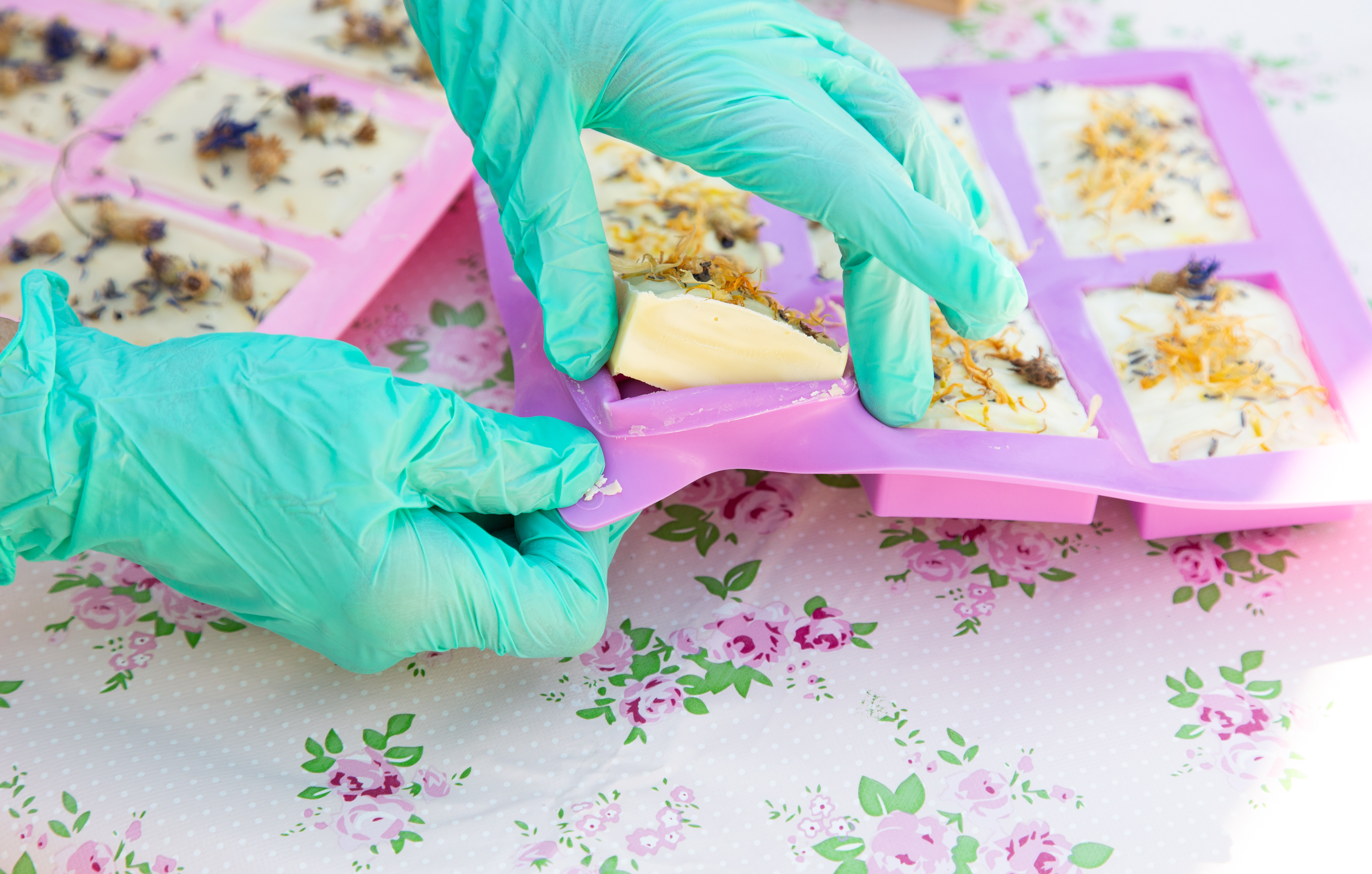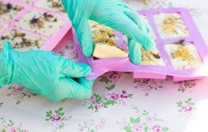 • Pour into the loaf tin/ soap moulds. Decorate with dried flower petals (optional).