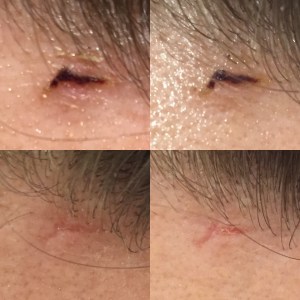 The following pictures show the stages of the wounds healing during the first week, until the scab fell off the lower cut (which happened naturally over night, I did not pick it*):