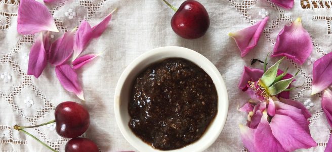 Jam made with rose water, cherries and chia seeds: Inspired by the deliciously simple ‘jam’ made as part of our breakfasts at a Rose Retreat in Bulgaria last year. Our incredible chef Sarah and her partner Andreas spent a considerable amount time de-stoning fresh cherries that happen to be in season around the time of the rose retreat!