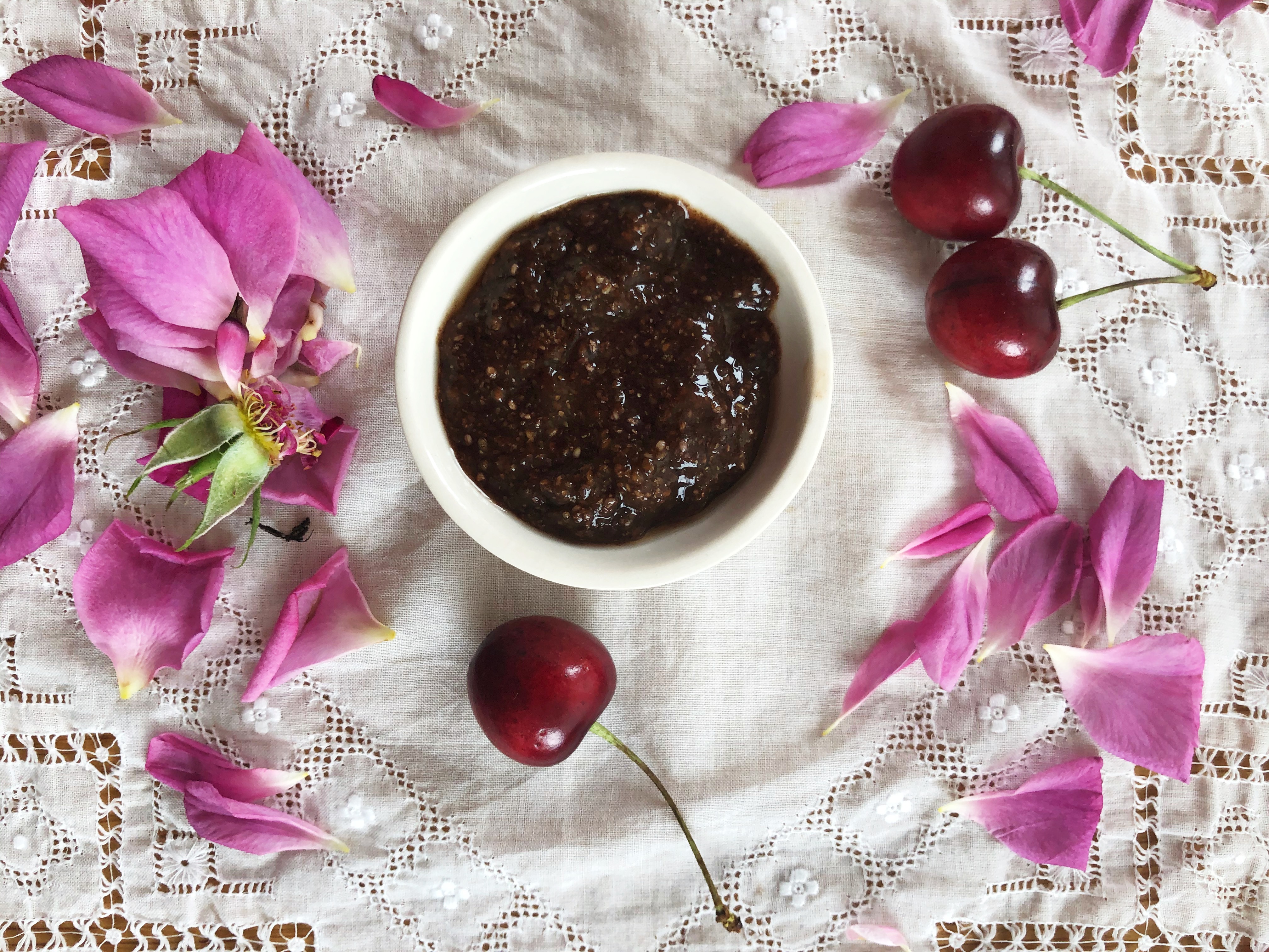 Tips: Use any fruit you like in place of the cherries and the rose water is not essential but certainly gives a floral twist. You could try blackberries when they are in season with a hint of lavender water. Be aware that different fruits will have different water content, and determine how runny or thick the jam becomes, so add more chia seeds for a thicker consistency.