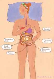 Cardamom & Grapefruit to help soothe, digest & detox – these would be lovely made into a blend* if you happen to have over indulged over the Christmas period. Find a comfortable place to lay down, massage the ‘digestive blend’ around your tummy in gentle anti-clockwise circles, begin just under your ribcage and massage around the centre of your tummy covering the small intestine, gradually moving down towards the start of the ascending colon, follow this up the right side of your body, as it becomes the transverse colon across the body under the ribs and then onto the descending colon down the left side of your body. Finish with a few large anti-clockwise circles and take a moment to rest.