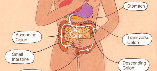 Once you’re set, place one hand on your heart to help settle your body and use the other hand to massage the oil or ‘digestive blend’ around your tummy.  Do this in small, gentle, anti-clockwise circles, initially just to apply the oil. Then you will follow the route of your digestive system, which goes clockwise, but make your massage movements anti-clockwise… begin at the stomach, just under your ribcage, then around the centre of your tummy covering the ‘small intestine’ area, gradually move down towards the start of the ‘ascending colon’, follow this up the right side of your body, then across the body as it becomes the ‘transverse colon’ and finally to the ‘descending colon’ down the left side of your body. You may feel to repeat, to focus on certain areas and to take a moment to rest once complete.