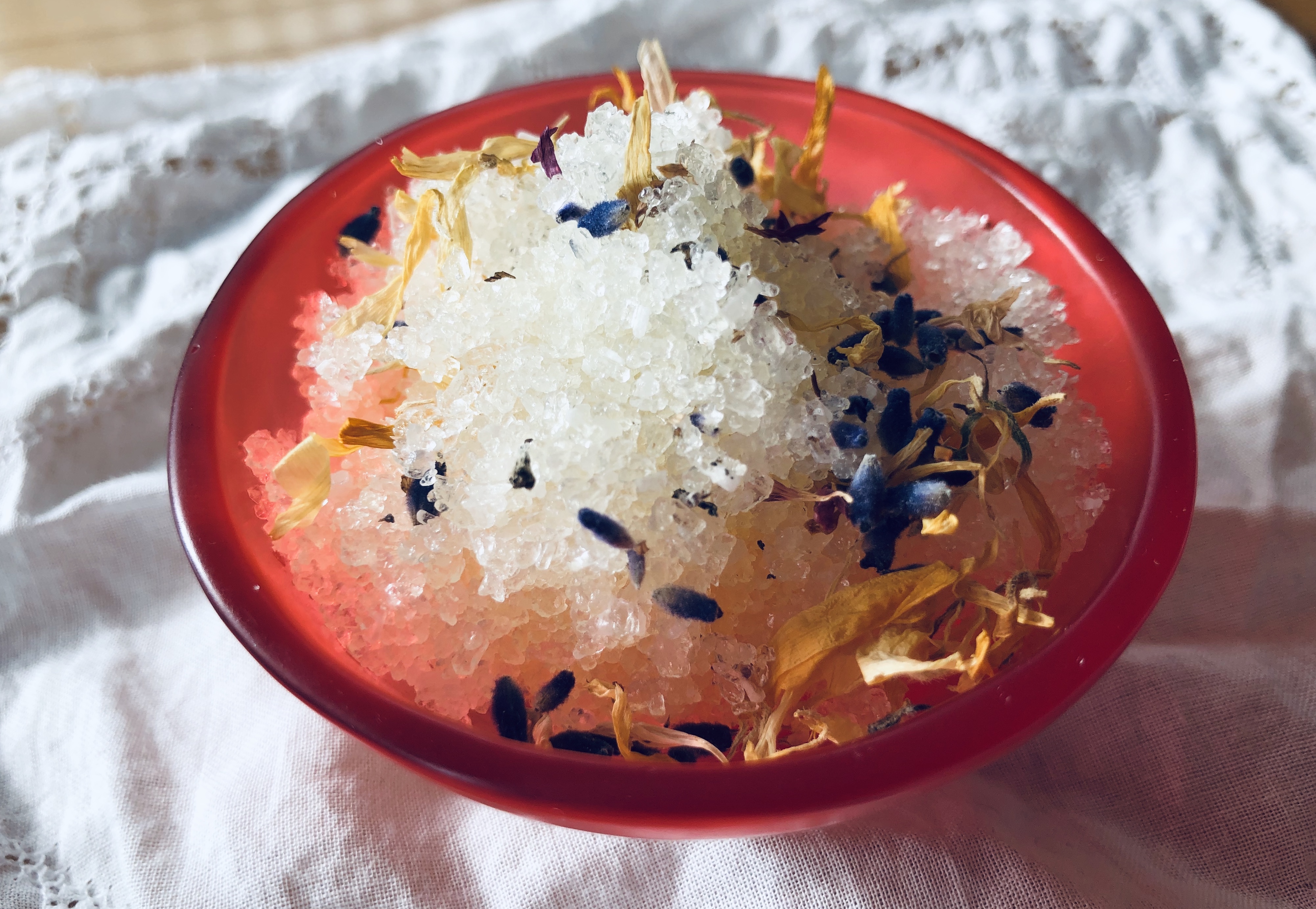 Tip: If you want to add flowers & petals to your bath salts, (e.g. rose, lavender, chamomile) sprinkle a few spoonfuls into the mix, enough for your desired visual effect. Note, that it can make the bath more difficult to clean afterwards, so wrapping all the salts/flowers/oils into a muslin cloth and tying them up with string will mean you don’t need to collect all the petals after your bath.